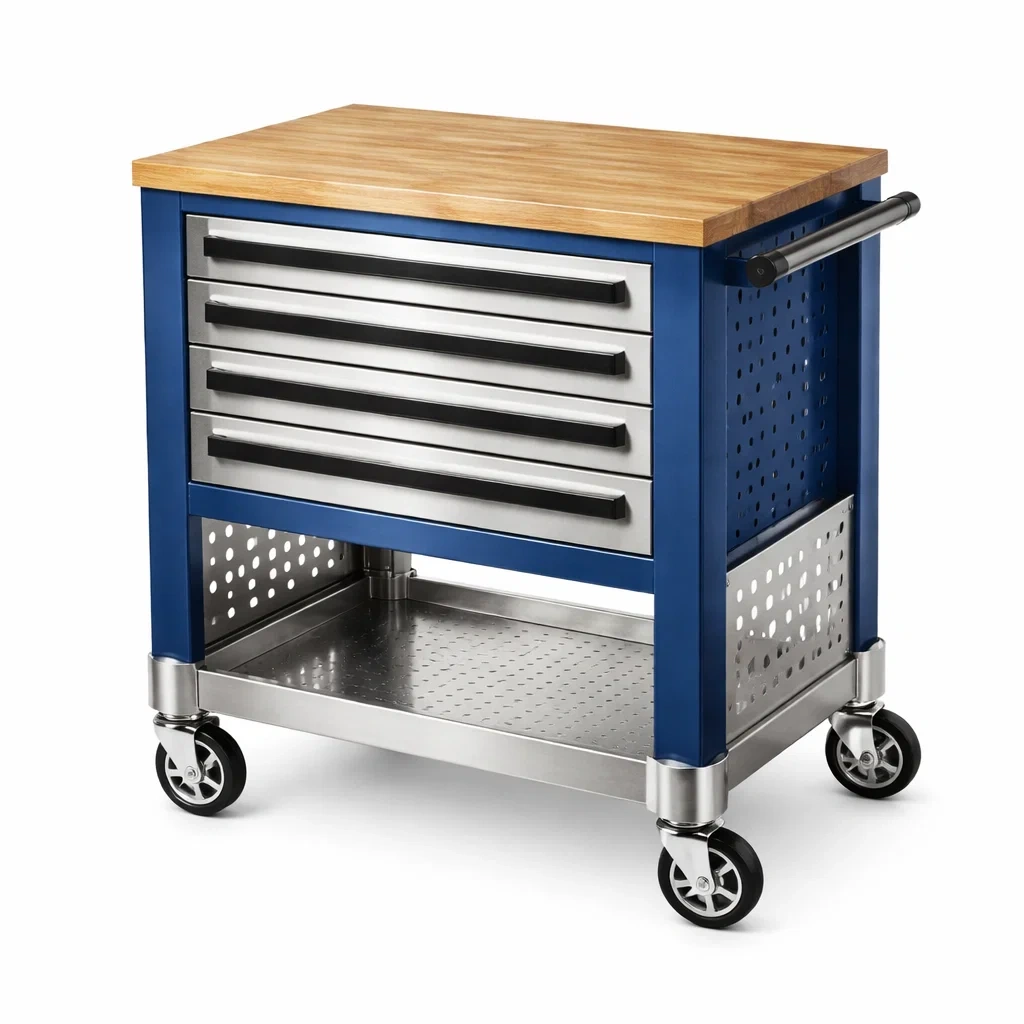 Ce chariot d'atelier est fabriqué en acier inoxydable avec un plateau en bois de hêtre. Il mesure 90 cm de longueur, 50 cm de largeur et 95 cm de hauteur. Le chariot dispose de quatre tiroirs en métal, d'une tablette inférieure ouverte et de roulettes équipées de freins pour une mobilité aisée. La structure en acier assure une grande résistance.