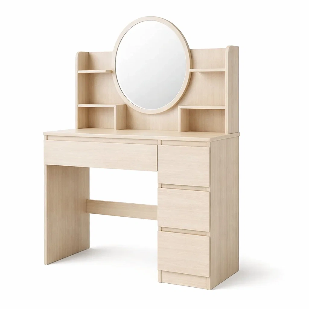 Cette coiffeuse est fabriquée en bois d'ingénierie avec un placage de chêne clair. Elle dispose d'un miroir rond et de plusieurs options de rangement, y compris 4 tiroirs et 4 étagères. Dimensions: 120 cm de longueur, 45 cm de largeur, et 140 cm de hauteur. Le poids total est de 45 kg.