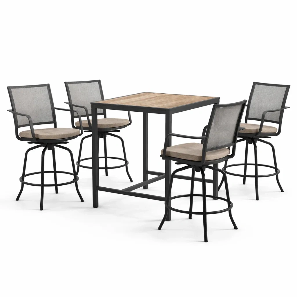 Ensemble de bar comprenant une table haute et quatre chaises pivotantes. La structure est en métal avec un plateau en bois composite. Les chaises sont dotées de coussins rembourrés en mousse de polyuréthane et d'un dossier en maille métallique.