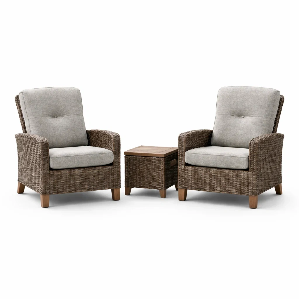 Matériau des fauteuils : rotin synthétique, coussins en tissu polyester